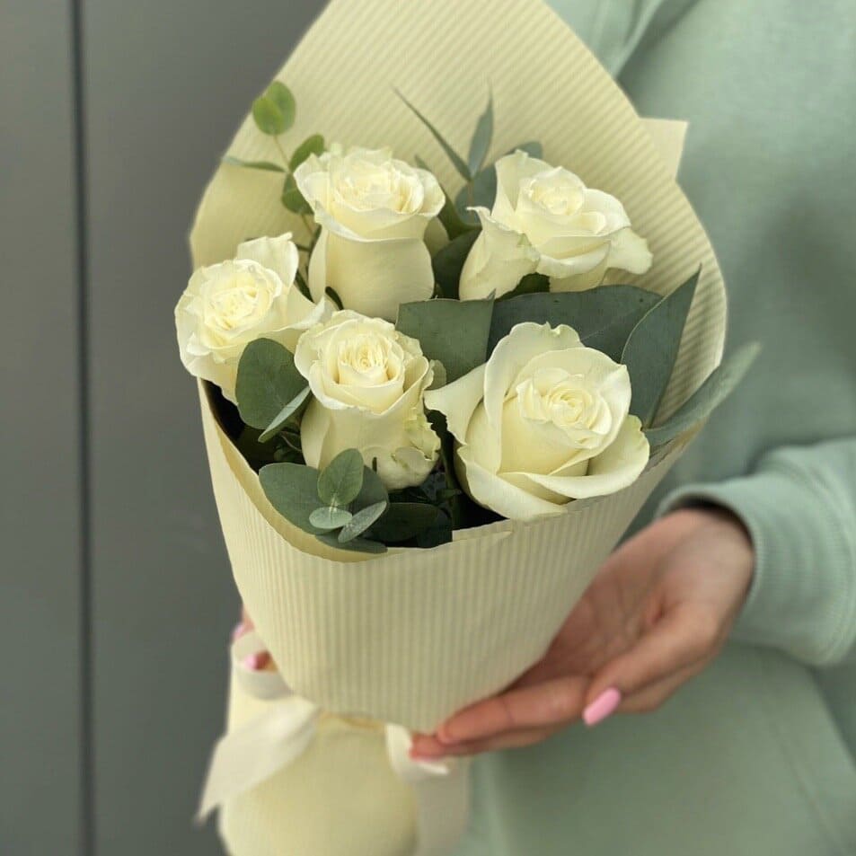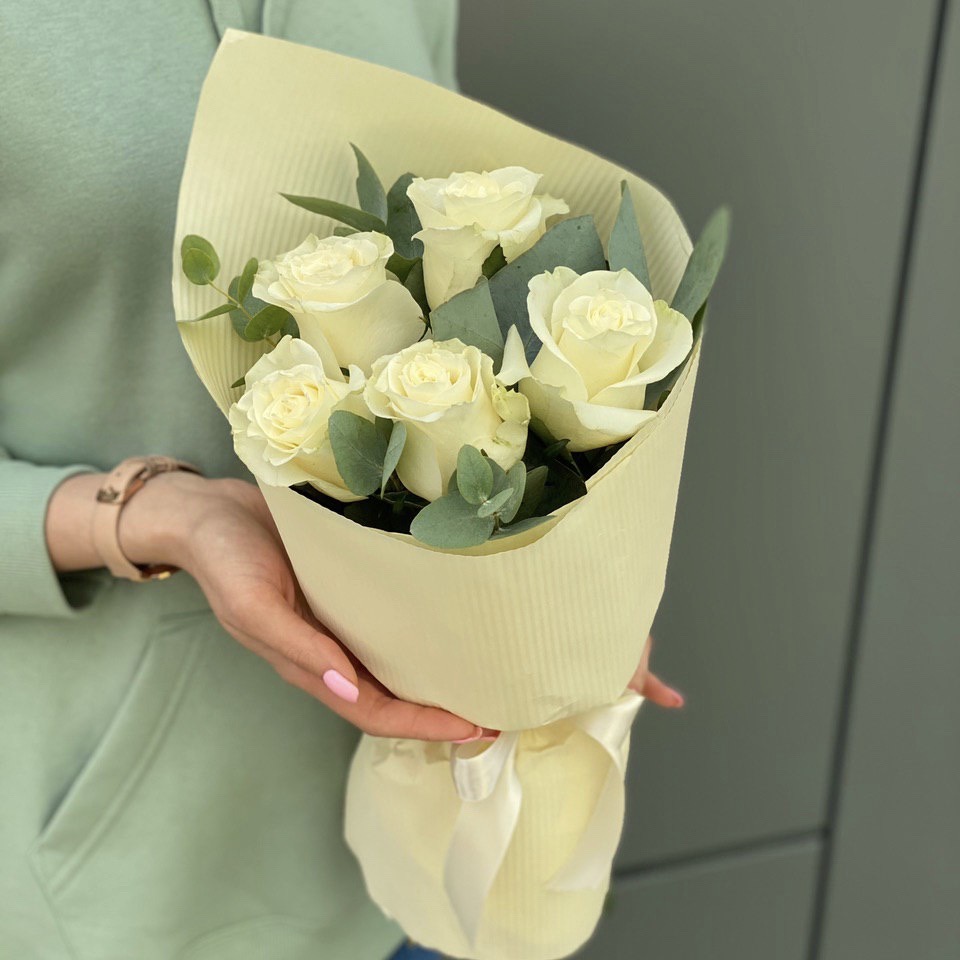 Состав: Роза белая (5) 50 см, Эвкалипт (1), Писташ (2), Оформление