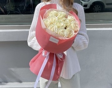 Букет из белых роз в обрамлении яркой стильной упаковки