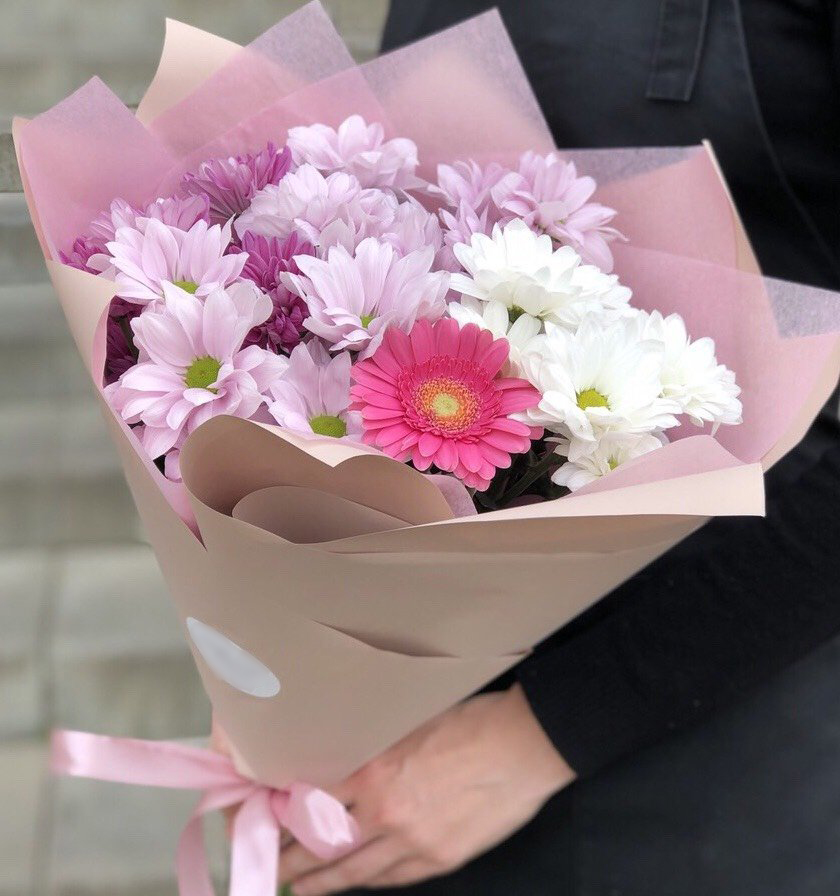 Состав: Хризантема(4), Гербера (1), Оформление (1)