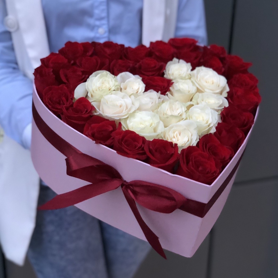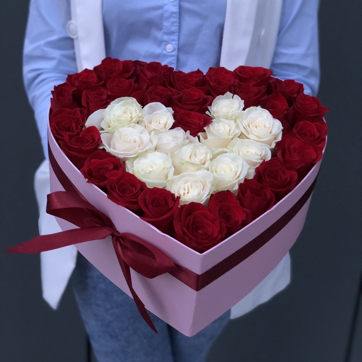 Состав: Роза красная (27), Роза белая (12), Коробка сердце (1), Оазис (2), Оформление