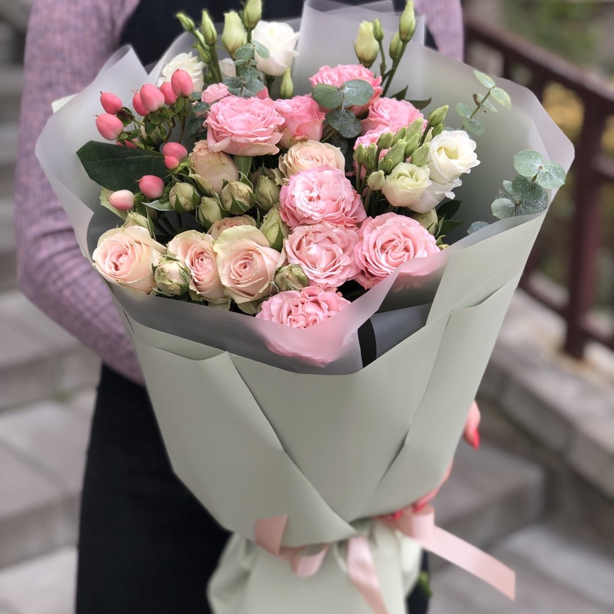 Состав: Эустома (3), Эвкалипт (1), Кустовая роза (4), Оформление (1).