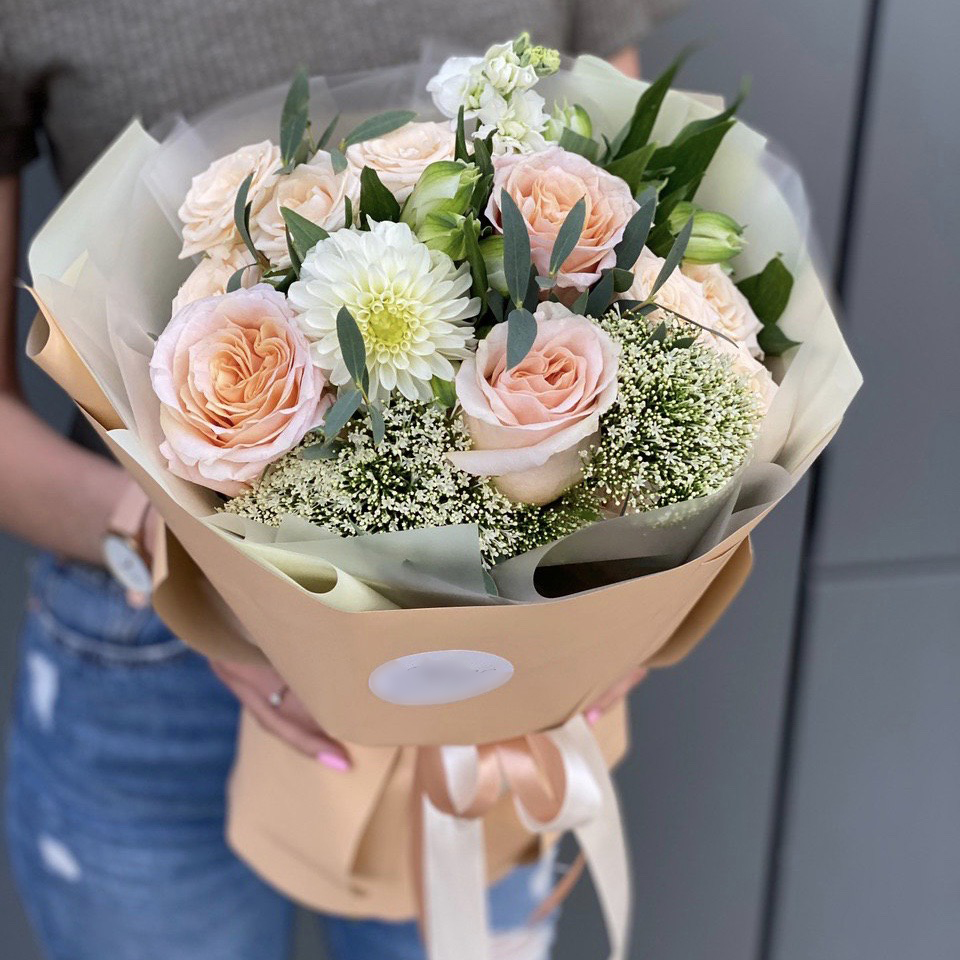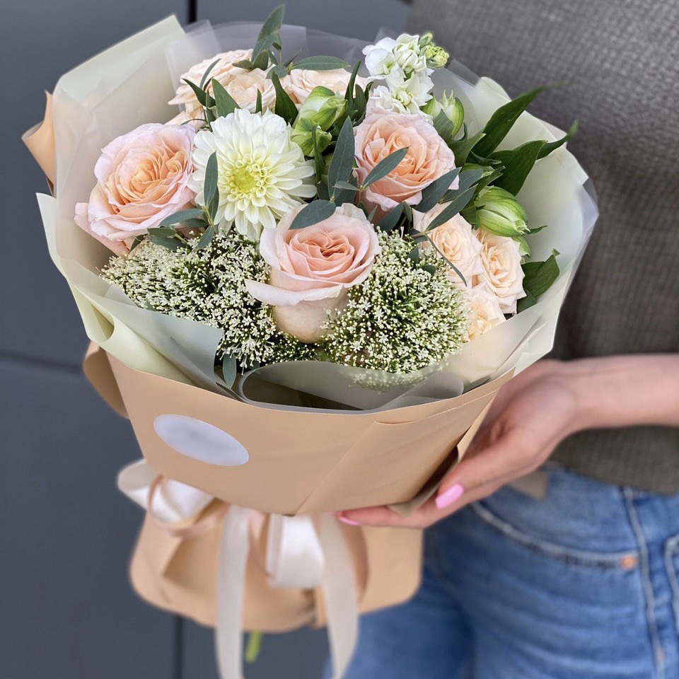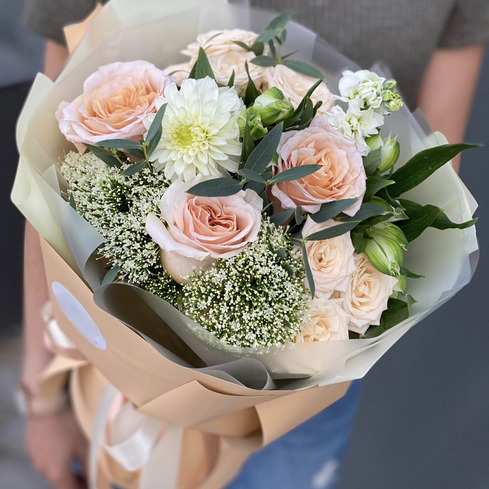 Состав: Роза одноголовая (3), Гипсофила (2), Георгина (1), Маттиола (1), Альстромерия (1), Кустовая роза (2), Эвкалипт (1), Писташ (1), Оформление