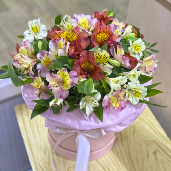 Яркая, разноцветная композиция из Альстромерий. Сам цветок долго живет и сохраняет приятный яркий вид.