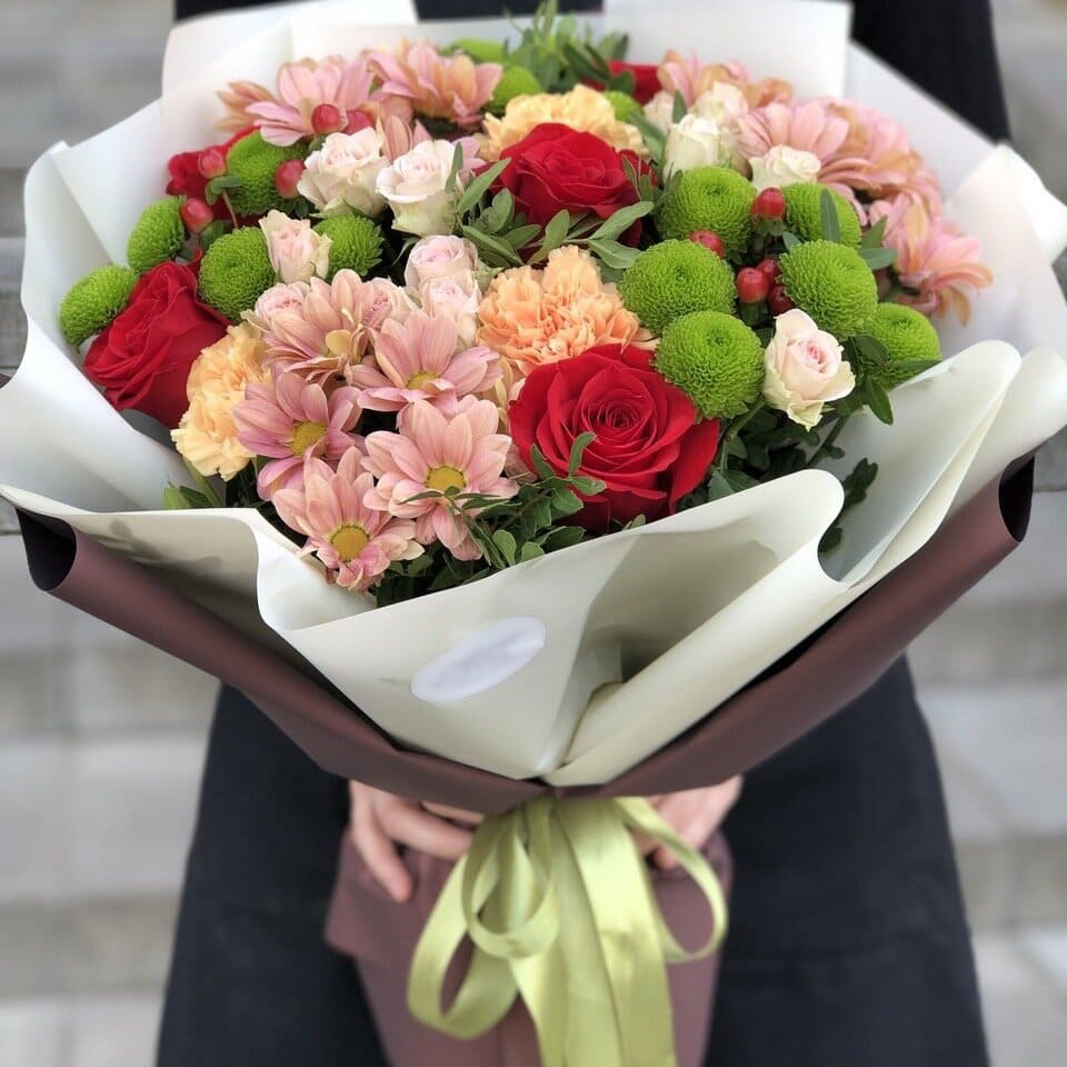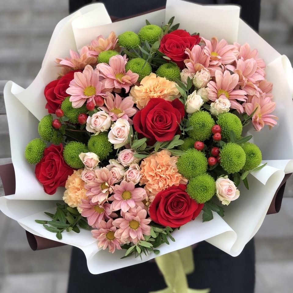 Состав: Хризантема (6), Роза красная 60 см (5), Писташ (3), Кустовая роза (2), Гиперикум (2), Гвоздика (3), Оформление