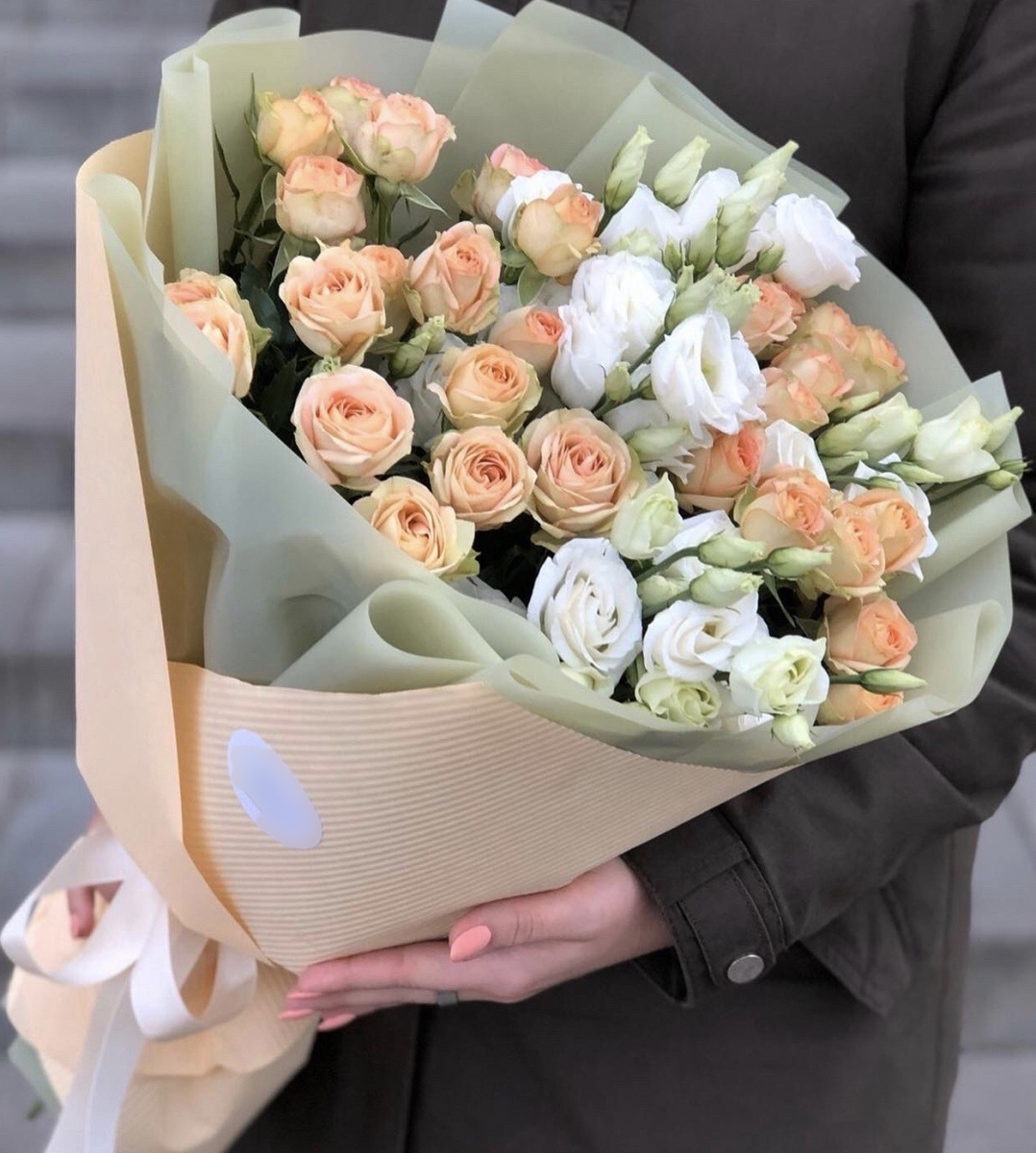 Когда дарите такой букет, слова действительно вовсе не нужны. Изящное сочетание белой эустомы с кремовой кустовой розой. Эта композиция подходит для творческих тонких натур и в одночасье передаёт ваши ласковые светлые чувства.