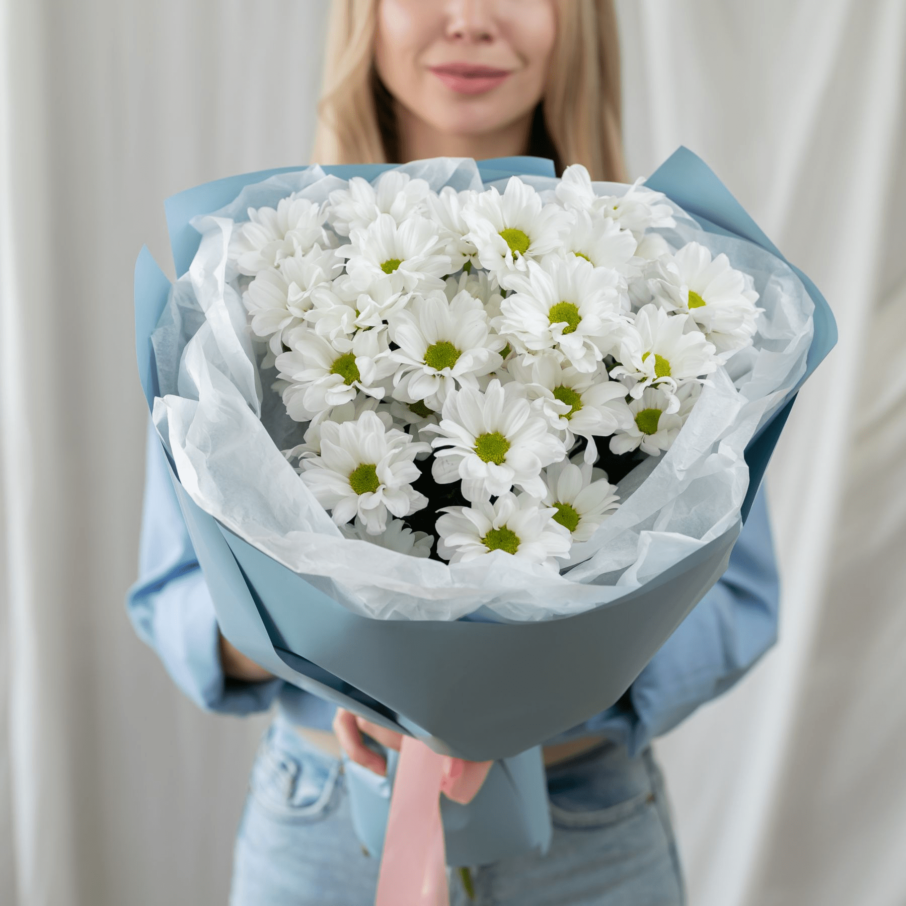 Воздушный букет из белой кустовой хризантемы, будто облачко обрамлен в пастельно голубую упаковочную бумагу. Природная красота данного цветка создаёт гармонию, где воздушность задаёт тон всему букету. Вперед за покупками.