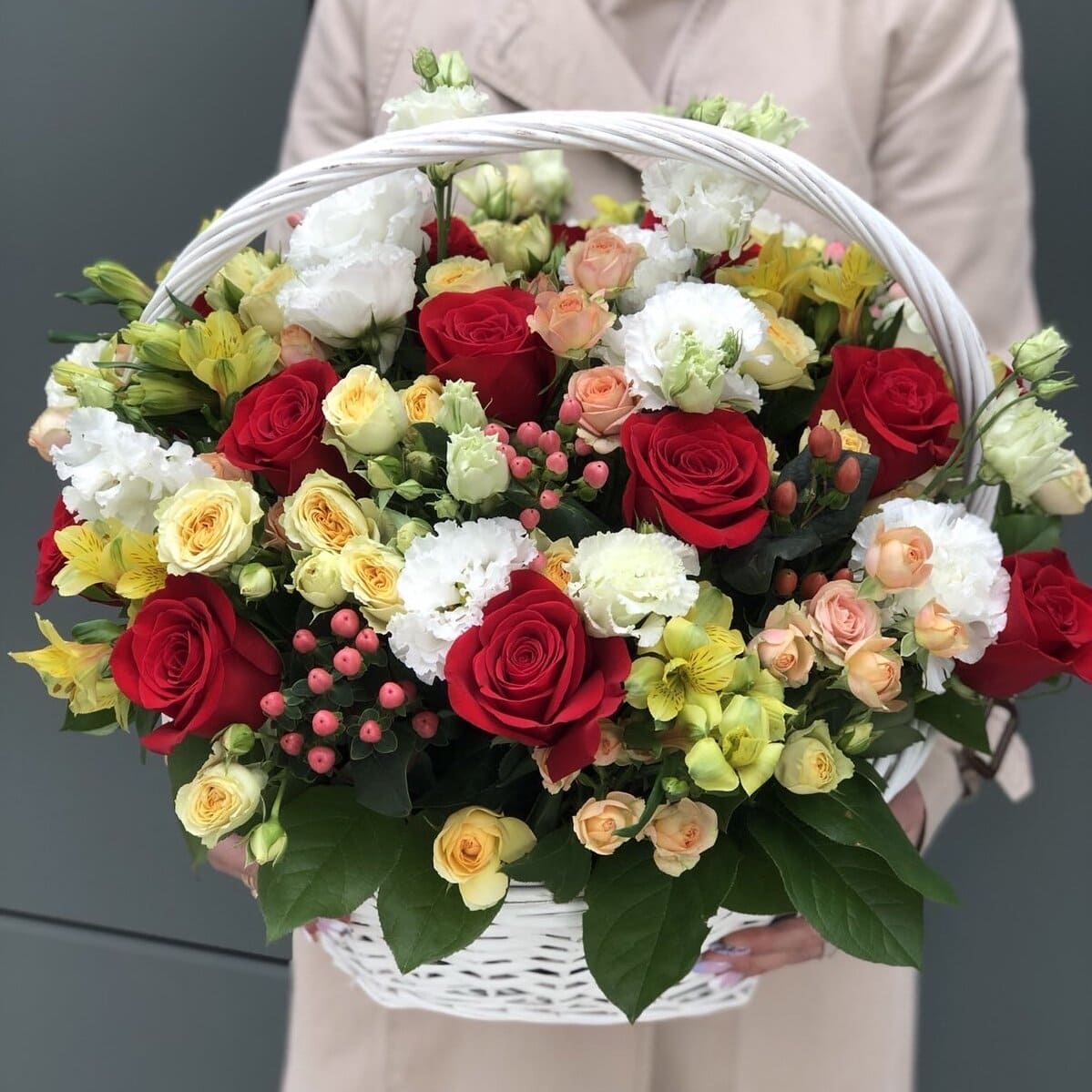 Стандарт: Эустома (5), Роза красная (15), Альстромерия (6), Гиперикум(5), Кустовая роза (13), Салал (6), Корзина