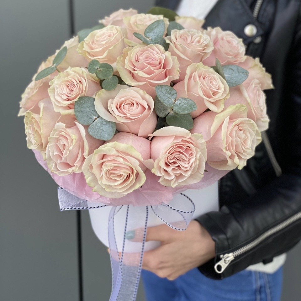 Состав: Роза розовая (25), Коробка (1), Оазис (2), Эвкалипт (1), Оформление