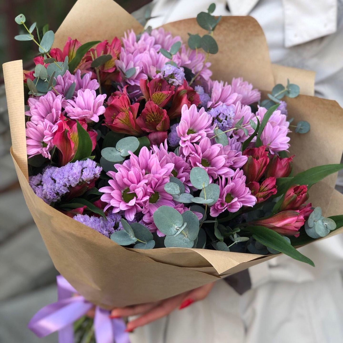 Состав: Хризантема кустовая(4), Альстромерия(4), Статица(2), Эвкалипт(2), Оформление